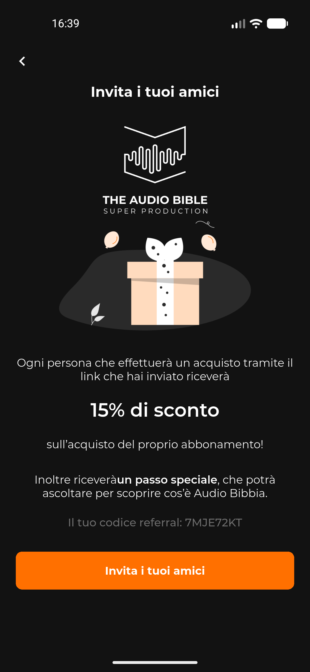 Consiglia l'app agli amici, invia sconti e offerte speciali. Espandi la comunità della Bibbia Audio condividendo l'ispirazione spirituale con gli altri.